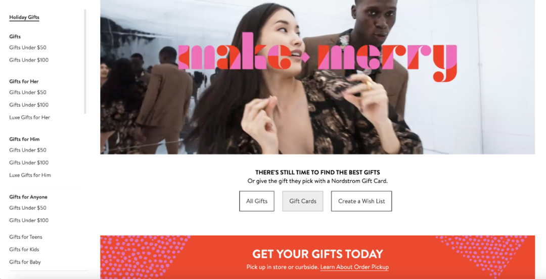 (Nordstrom 在独立站增添有 Make Merry 选项,每天为消费者推送礼物灵感。)如果商家能够提供不同的礼品搭配,既能帮助消费者节省挑选时间,又能提高客单价和销量。并且,商家还可以结合礼物清单,在独立站内为消费者准备好一些现成的礼品包,这不失为一种较少引起消费者反感的捆绑销售的好方法。![]()