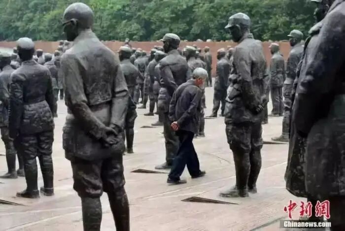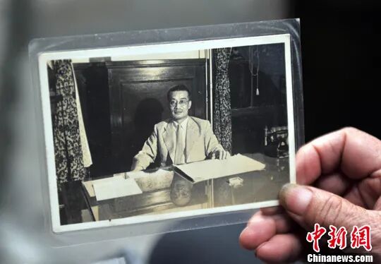 图为梅汝璈的堂弟梅汝璜老人,向记者展示梅汝璈参加“东京审判”期间的照片。中新社发 刘占昆 摄