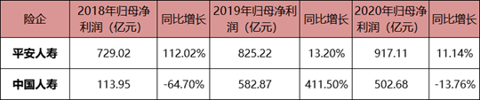 2018年-2020年,中国人寿分别实现归母净利润113.95亿元、582.87亿元、502.68亿元,同比-64.7%、411.5%、-13.76%;而同一时期的平安人寿分别实现归母净利润729.02亿元、825.22亿元、917.11亿元,同比增长112.02%、13.2%、11.14%。