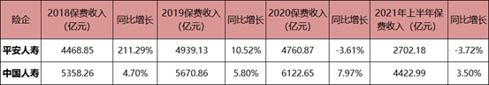 2021年上半年,平安人寿实现净利润(未执行新金融工具相关会计准则下的计算口径)158.52亿元,同比下滑65.88%;同期中国人寿实现归母净利润409.75亿元,同比增长34.2%。
