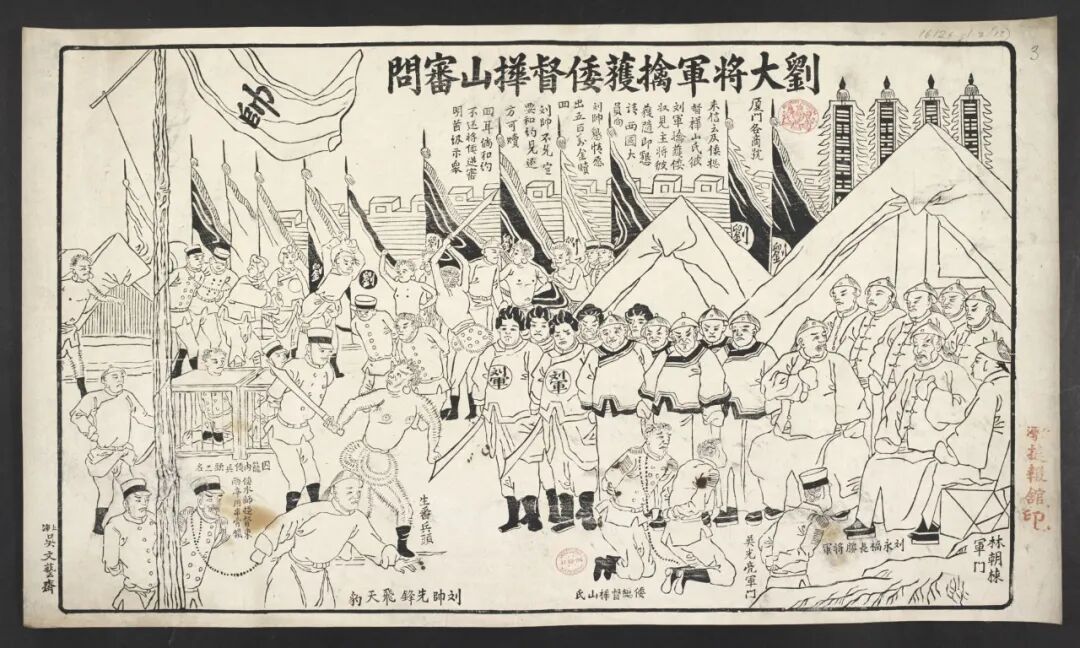 再比如下面这幅图画新闻,题为《刘大将军擒获倭督桦山审问》。画作署名“上海吴文艺斋”。与绘图配套的文字说明是:“厦门各商号来信云及,倭总督桦山氏彼(原文如此)刘军擒获。倭奴见主将彼获,随即恳请西国大员向刘帅恳,情愿出五百美金赎回。刘帅不允,定要和约见还,方可赎回耳,倘和约不还,将倭逆审明首级示众。”
