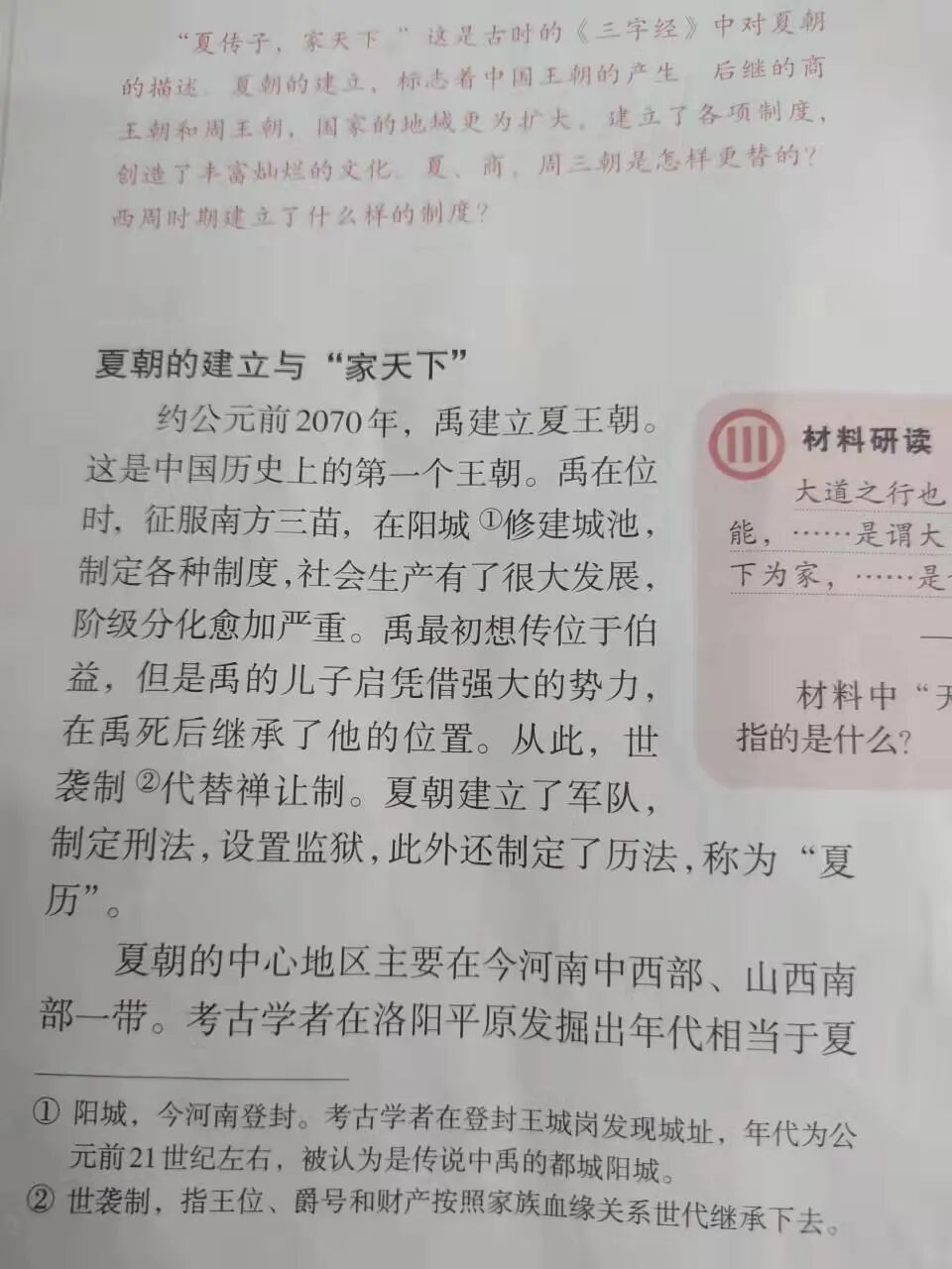 再往前追溯,2001年之前的人教社初中历史教材,一律是以禹的儿子启为夏朝的开国之君。