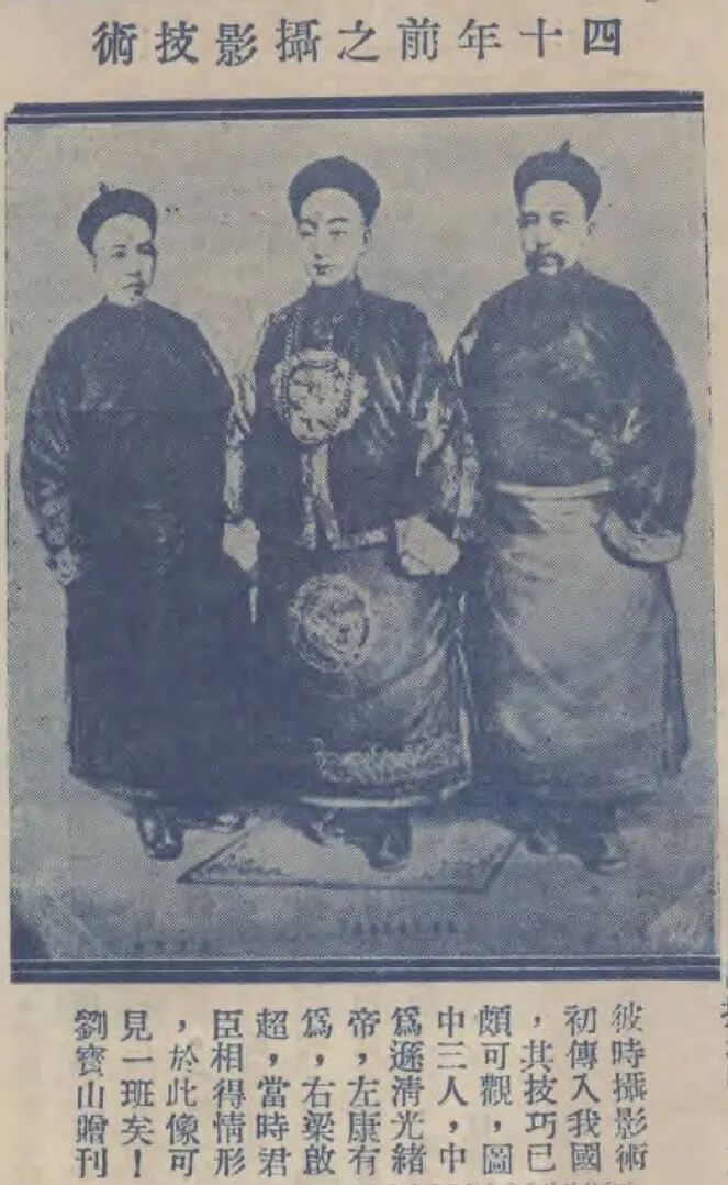 孔在清宫档案中发现,收了庆亲王与袁世凯等人的钱,然后呈递密折攻击岑春煊乃康有为一党者,是当时在翰林院任职的恽毓鼎。恽在密折里说,“康有为、梁启超现已到沪,与岑春煊时相过往”,“臣又访得岑春煊幕中有粤人麦孟华……所有密谋秘计,惟麦孟华之言是从”。还提到了岑春煊“本系戊戌年保国会领袖”(这确是事实,将既往的事实与当下的迹象搅合到一起,是该密折的最为阴险之处),说他“与康有为、梁启超、麦孟华诸逆密相勾结,臣不知其是何居心”。恽毓鼎的密折写于该年旧历七月。当时,瞿鸿禨已在庆亲王与袁世凯等人的攻击下倒台(恽毓鼎正是拿钱写密折攻击瞿鸿禨之人),岑春煊则被外放两广总督。岑到了上海之后便称病滞留,观望京城的政局变化。慈禧出于信任(岑在庚子年有护驾之功),对岑一再包容准假,并不催促。庆亲王与袁世凯对此深感担忧,遂授意恽毓鼎写密折攻击岑,将岑滞留上海之举解读为与上海的康党勾结。密折末尾提出的处理建议是:“事机万急,安危所争,间不容发,若到任后始行查办,则有兵权财权在手,又有凶逆为之主谋,不可复制矣。”——事情已经到了最危险的时刻,若是等岑春煊抵达两广就任,手里有了兵权财权,又有康党帮助,事情就麻烦了。⑥遗憾的是,孔祥吉发现的这份密折,没有提到照片,只声称“证以所见各处函电,均确凿可凭”——有许多函电可以证明岑春煊确实在与康有为、梁启超接触。这或许意味着恽毓鼎递交密折时,并没有从袁世凯手上拿到假照片。而且,恽呈递密折的时间是七月初二,两天后,七月初四,慈禧便下旨让岑春煊“开缺安心调理”——你不是说自己身体不好吗?那这两广总督就不要做了,回家安心调养身体吧。首先,以庆亲王与袁世凯的能量,要彻底扳倒岑春煊,不会只走恽毓鼎这一条途径。既然将岑与康党捆绑到一起,是他们的既定策略,便还会循着这个方向做其他的安排。1907年前后的慈禧正极度迷恋照相,制造假照片显然是很好的政治斗争手段。其次,若有假照片存在,不让恽毓鼎知晓,不让恽毓鼎在密折里提及,才是最合适的做法——可以让慈禧产生错觉,认为自己得到了两条不同路径的“信息源”。反之则是大败笔,等同于是在提醒多疑的慈禧。再次,与岑春煊的回忆录、刘成禺的杂忆皆写于民国时代不同,胡思敬《国闻备乘》中的这段文字写于晚清。胡当时是一名京官。他写作《国闻备乘》,是不满当时的起居注省略删减了许多事情不记,欲做一种补充。其中,“书中称太后、上者,光绪朝所作;称孝钦、称德宗者,宣统时所作。”⑦前文所引那段记载,称呼慈禧为“太后”,可知写于1908年慈禧去世之前。换句话说,这是一名注重史料搜集的京官,在高层政治变局发生之后不久得到的信息。♦ 这张康、梁与光绪皇帝的合影,也是一张著名的假照片。不过,它首次现世,已是1936年(四十年前之攝影技術, 《北晨画刊》第8卷第3期)。伪造者很可能是民国人,照片中的光绪皇帝像也是假的,若是康有为在清末造假,显然骗不过那些见过光绪皇帝之人。所以,这张照片不能算“清末的伪造照片事件”。
