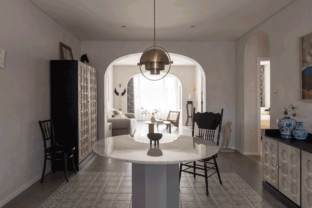 这里的线条是设计师借鉴了装饰艺术(art-deco)的风格。这种风格其实和全屋风格并不相关.但是,由于叠加的拱形和室内的拱门洞相互呼应,在结构形式上,它和屋子又是统一的。电视墙正好处在一个我们视觉经常会落到地方,这些叠加的拱和旁边平滑的墙面对比,自然而然的就让墙面的光影丰富起来,我们的视线也就有了落点。餐桌上的吊灯也是同样道理,呼应着全屋的拱形,但是金属的质感又可以在整个朴素配色的家中凸显出来。