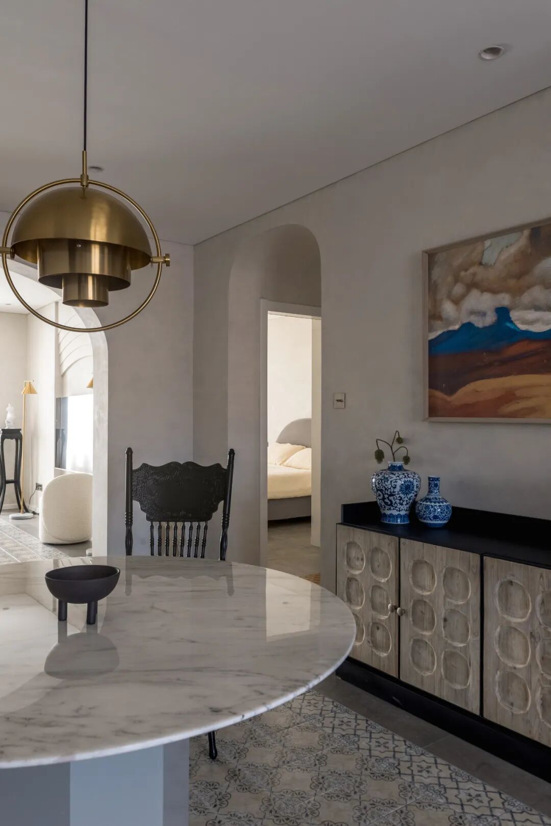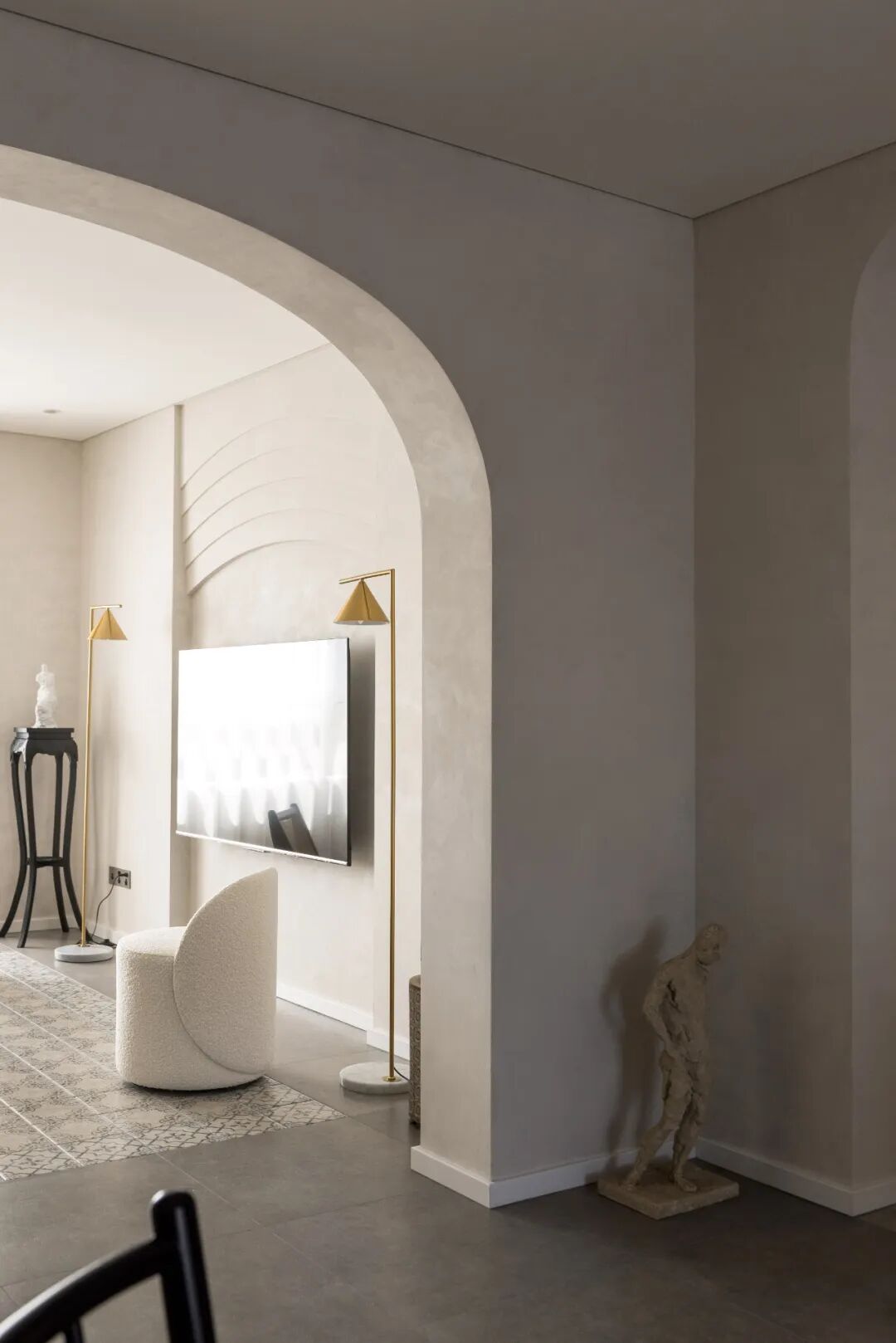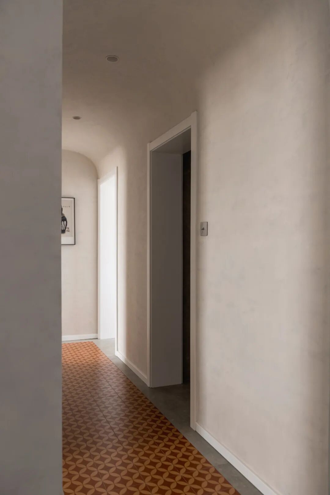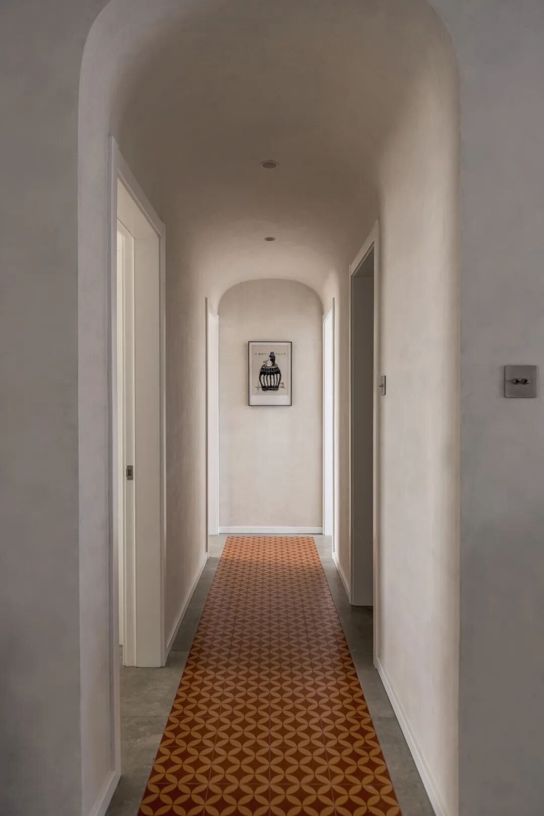 「宗教感」本身不是人们对家的固有印象。但本案的宗教感和屋主产生联系,自然就会有一种归属感。重点不是“宗教”,而是“归属感”。归属感,怎么让家看着像是自己的呢?看看自己的衣柜,根据自己的穿搭来设计不就好了。设计师就是受到女主人穿衣风格的启发,全屋都用了低饱和度和淡雅的材料和装饰。墙面全部使用的是暖色的艺术灰泥,这种涂料是艺术漆的一种,施工比较简单。主要优点就是灰泥用的是天然材料,所以环保绝对没问题,其次就是质感比较好,会让家里的墙面颜色不会是单一的灰,而是有肌理感的自然感受。除了屋主的穿衣风格,配色的灵感来自卡达尔首都多哈的传统市集——Souq Waqif。这是伊斯兰国家的市集,所以配色上和全屋来自清真寺的拱结构并不会割裂,因为来自于相同地域文化,所以墙面配色反而和房屋结构看上去是相搭配的。地面瓷砖大面积选择了灰色,每个空间则使用了淡雅的小花砖作为空间区分。家里的花砖铺的很像是地毯。这是因为女主人喜欢地毯,但是又不想打理,用小花砖代替地毯,比清洁地毯更加方便,还能让地面变化更有节奏。小花砖的花纹也用了穆斯林风格,保持元素统一的同时又能让整个屋子的质感不单一。走廊则是选择了橙色的瓷砖,向红毯一样通向静区的各个区域。全屋的材料和色彩运用来自女主人的穿搭,但是还是贯穿了上文讲的清真寺的元素。一个主题元素嵌入不同内容,就像一个命题作文可以写出很多形式的作品一样,虽然材料、装饰和质感都有不同,但是他们的核心主题都是一样的。一个主题的统一,并不代表单调。就跟张爱玲的光写红色就能写出33种不同感受一样,同一个主题也可以变换出不同花样。