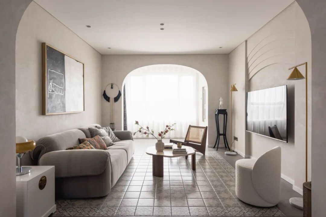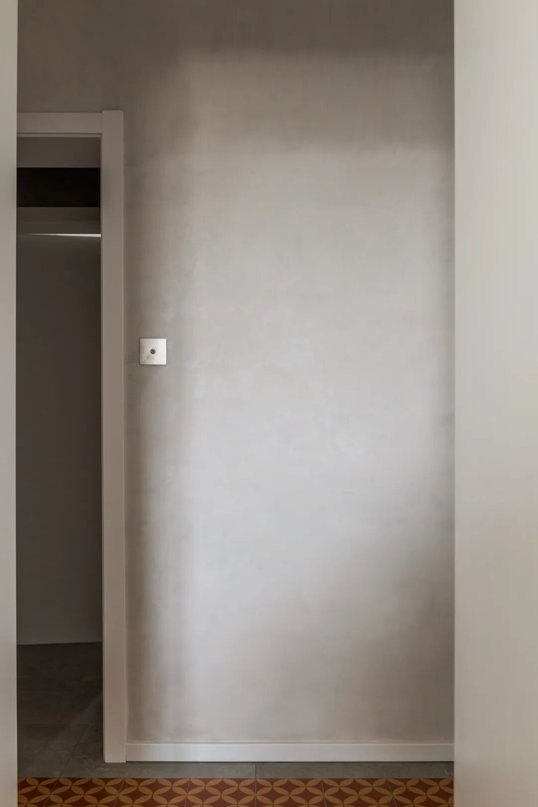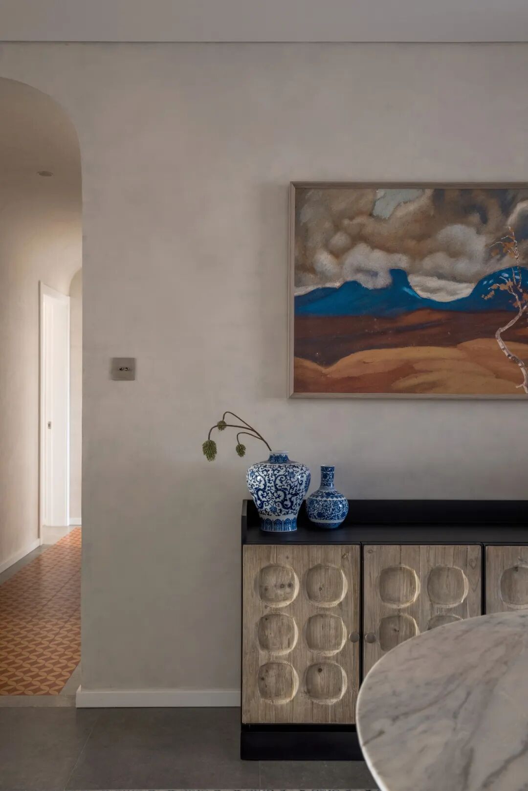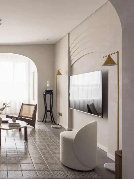 「宗教感」本身不是人们对家的固有印象。但本案的宗教感和屋主产生联系,自然就会有一种归属感。重点不是“宗教”,而是“归属感”。归属感,怎么让家看着像是自己的呢?看看自己的衣柜,根据自己的穿搭来设计不就好了。设计师就是受到女主人穿衣风格的启发,全屋都用了低饱和度和淡雅的材料和装饰。墙面全部使用的是暖色的艺术灰泥,这种涂料是艺术漆的一种,施工比较简单。主要优点就是灰泥用的是天然材料,所以环保绝对没问题,其次就是质感比较好,会让家里的墙面颜色不会是单一的灰,而是有肌理感的自然感受。除了屋主的穿衣风格,配色的灵感来自卡达尔首都多哈的传统市集——Souq Waqif。这是伊斯兰国家的市集,所以配色上和全屋来自清真寺的拱结构并不会割裂,因为来自于相同地域文化,所以墙面配色反而和房屋结构看上去是相搭配的。地面瓷砖大面积选择了灰色,每个空间则使用了淡雅的小花砖作为空间区分。家里的花砖铺的很像是地毯。这是因为女主人喜欢地毯,但是又不想打理,用小花砖代替地毯,比清洁地毯更加方便,还能让地面变化更有节奏。小花砖的花纹也用了穆斯林风格,保持元素统一的同时又能让整个屋子的质感不单一。走廊则是选择了橙色的瓷砖,向红毯一样通向静区的各个区域。全屋的材料和色彩运用来自女主人的穿搭,但是还是贯穿了上文讲的清真寺的元素。一个主题元素嵌入不同内容,就像一个命题作文可以写出很多形式的作品一样,虽然材料、装饰和质感都有不同,但是他们的核心主题都是一样的。一个主题的统一,并不代表单调。就跟张爱玲的光写红色就能写出33种不同感受一样,同一个主题也可以变换出不同花样。