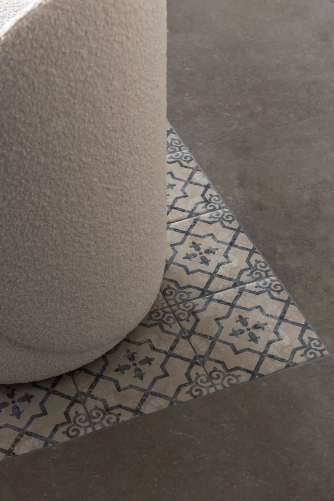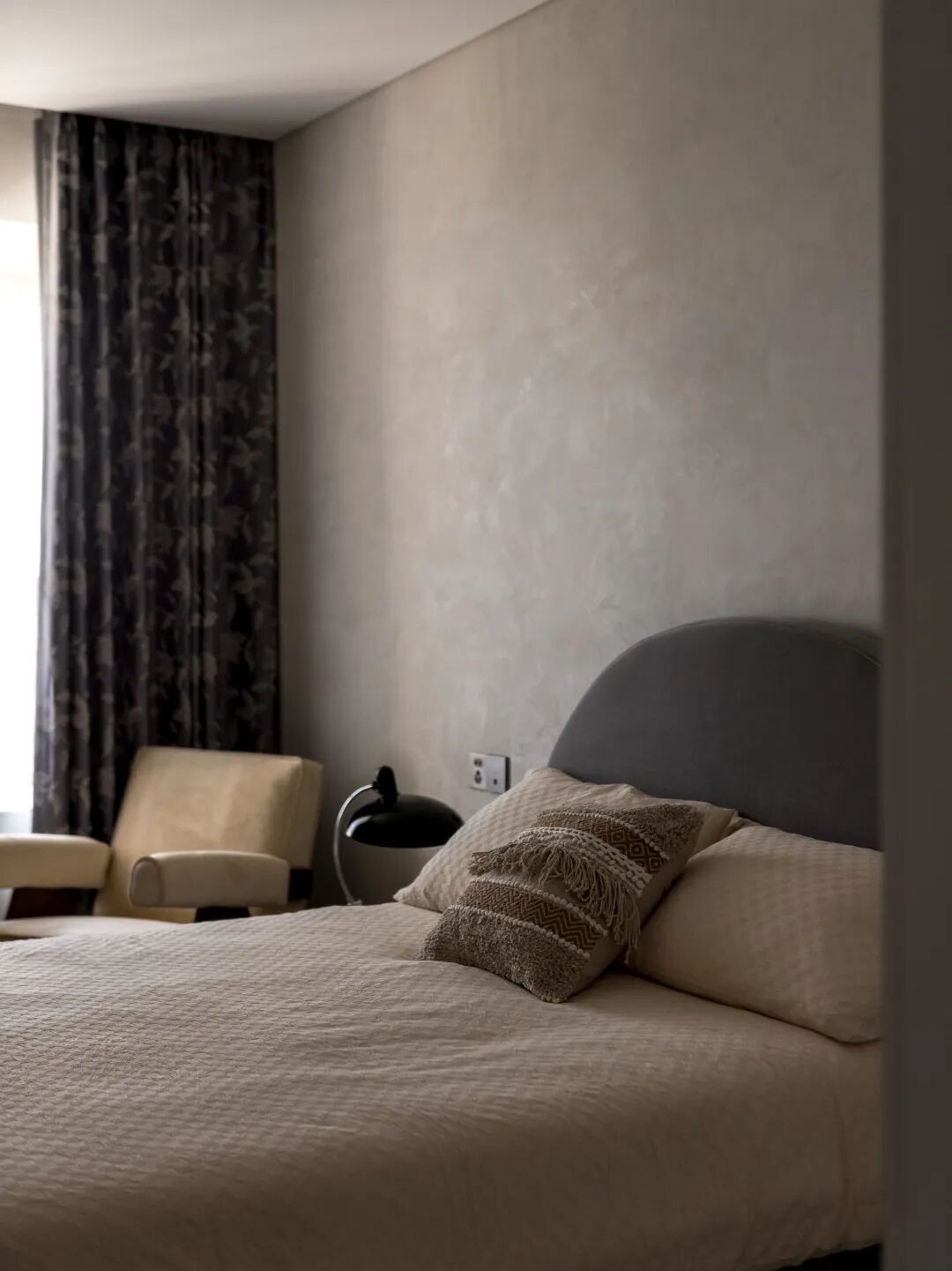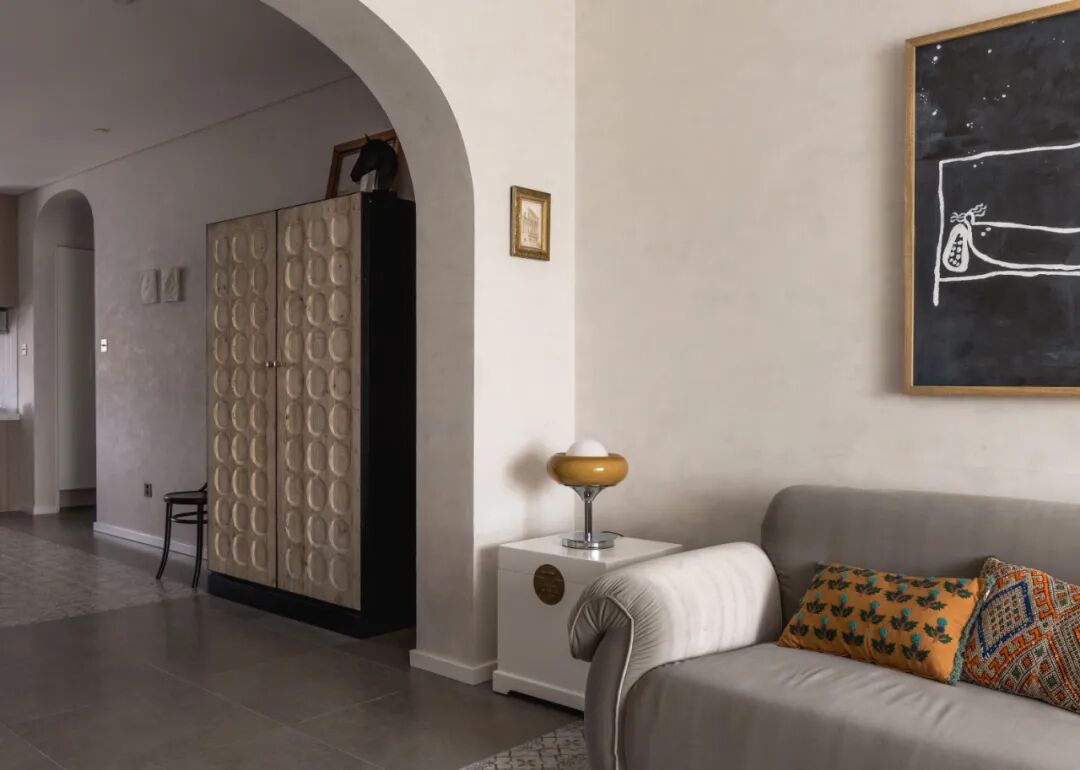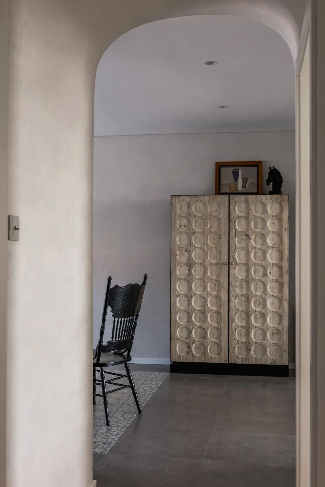 「宗教感」本身不是人们对家的固有印象。但本案的宗教感和屋主产生联系,自然就会有一种归属感。重点不是“宗教”,而是“归属感”。归属感,怎么让家看着像是自己的呢?看看自己的衣柜,根据自己的穿搭来设计不就好了。设计师就是受到女主人穿衣风格的启发,全屋都用了低饱和度和淡雅的材料和装饰。墙面全部使用的是暖色的艺术灰泥,这种涂料是艺术漆的一种,施工比较简单。主要优点就是灰泥用的是天然材料,所以环保绝对没问题,其次就是质感比较好,会让家里的墙面颜色不会是单一的灰,而是有肌理感的自然感受。除了屋主的穿衣风格,配色的灵感来自卡达尔首都多哈的传统市集——Souq Waqif。这是伊斯兰国家的市集,所以配色上和全屋来自清真寺的拱结构并不会割裂,因为来自于相同地域文化,所以墙面配色反而和房屋结构看上去是相搭配的。地面瓷砖大面积选择了灰色,每个空间则使用了淡雅的小花砖作为空间区分。家里的花砖铺的很像是地毯。这是因为女主人喜欢地毯,但是又不想打理,用小花砖代替地毯,比清洁地毯更加方便,还能让地面变化更有节奏。小花砖的花纹也用了穆斯林风格,保持元素统一的同时又能让整个屋子的质感不单一。走廊则是选择了橙色的瓷砖,向红毯一样通向静区的各个区域。全屋的材料和色彩运用来自女主人的穿搭,但是还是贯穿了上文讲的清真寺的元素。一个主题元素嵌入不同内容,就像一个命题作文可以写出很多形式的作品一样,虽然材料、装饰和质感都有不同,但是他们的核心主题都是一样的。一个主题的统一,并不代表单调。就跟张爱玲的光写红色就能写出33种不同感受一样,同一个主题也可以变换出不同花样。
