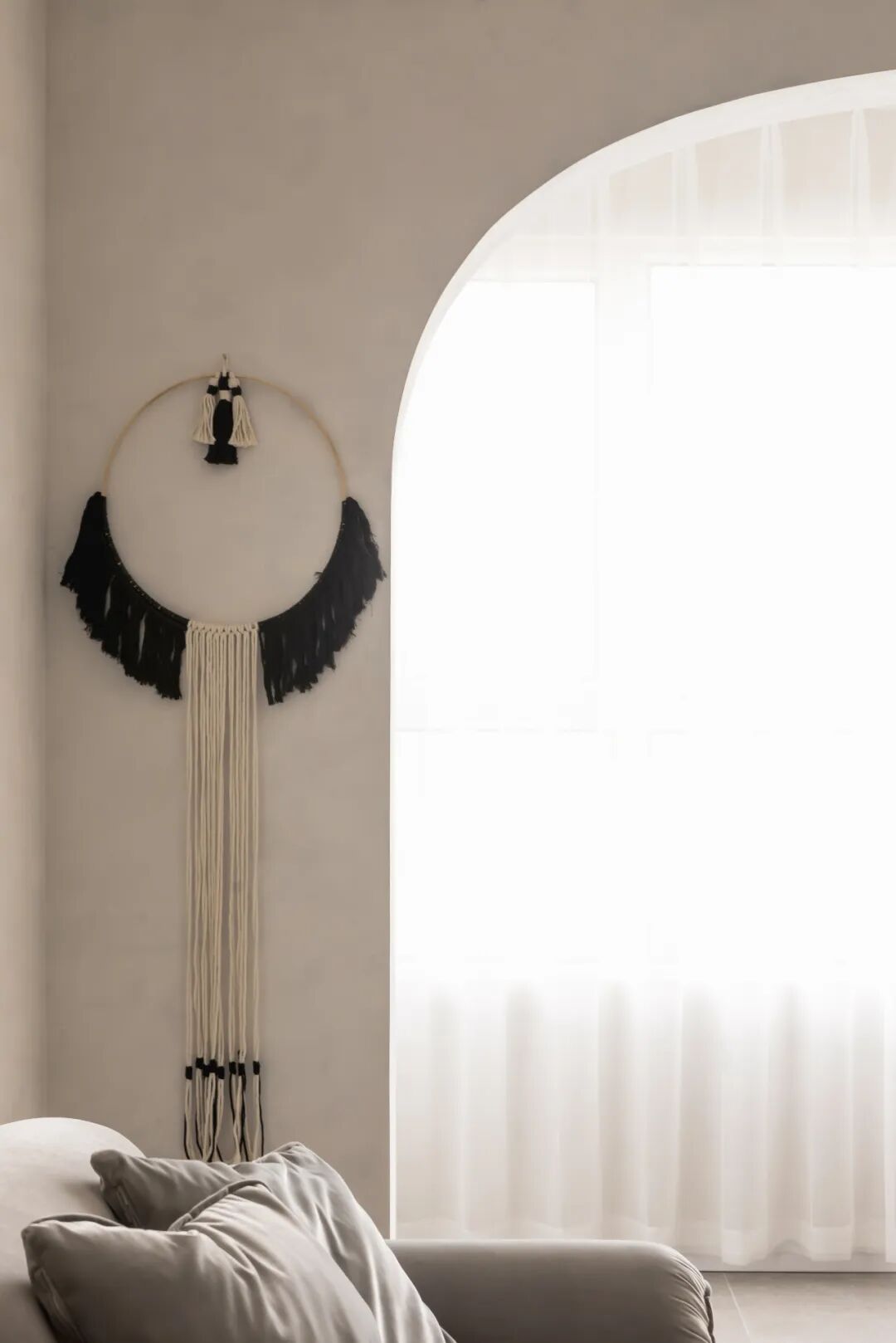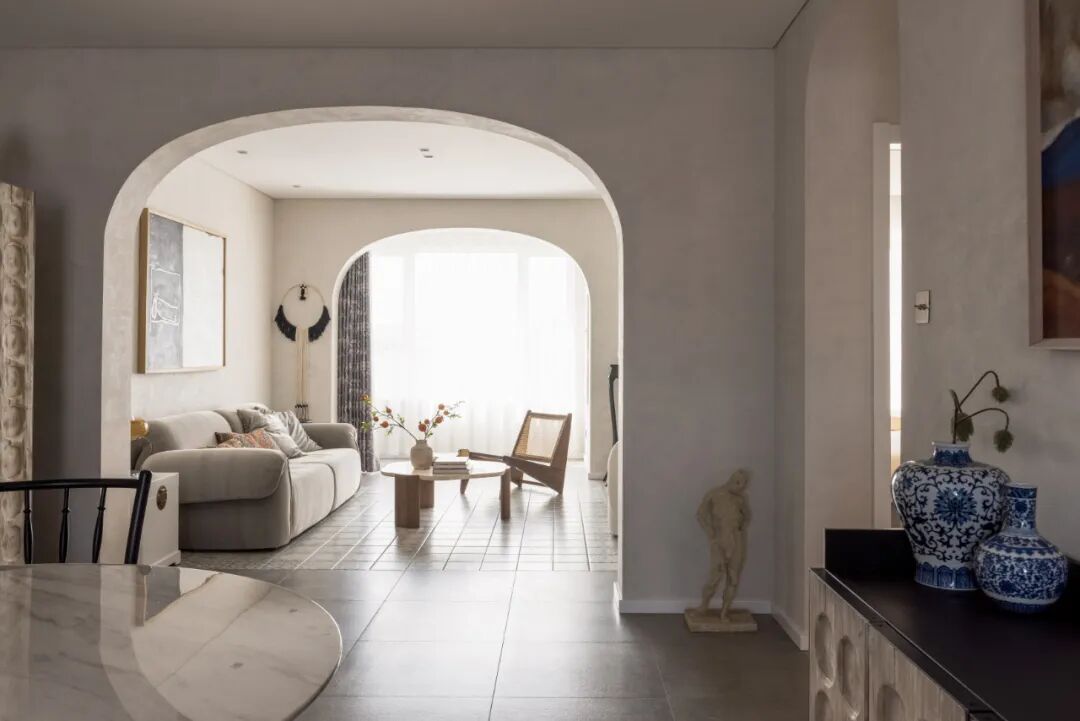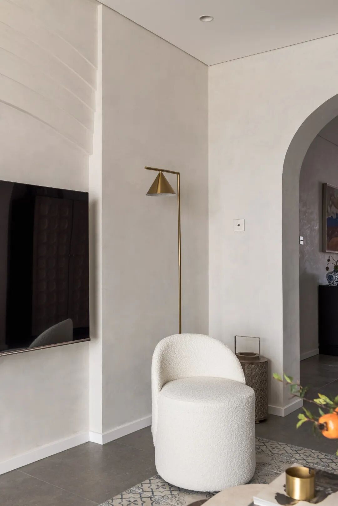 空间除了需要两间卧室外没有其他特殊需求,屋主希望设计师可以尽情发挥。因为全屋剪力墙,格局基本没法变化,只是拆掉了厨房的填充墙扩大了厨房的操作台面积。虽说是尽情发挥,但一个家也要具备屋主的个人气质,让屋主回到家之后有归属感。整个屋子宗教感的椭圆拱门,灰泥质感的墙面,全屋朴素自然的软装搭配,让这个家有一种独特的清净感。而这些设计灵感,其实都来自屋主的宗教和穿搭风格。因此,房屋自然而然就有了屋主的个人气质。设计师也说:“从精神出发,建筑最后依然要回到精神,空间亦是如此。”屋主小姐姐是回族人,设计师就用清真寺拱形作为主要的空间要素来贯穿整个家。尖拱显然在室内没法实现,设计师选择了这种半椭圆型的拱门,和常规的给人稳定和经典感受的半圆拱有所区分,带来一种和清真尖拱相似的异域感受。从一进门开始,从餐厅看到客厅再到阳台,两面拱形墙就框定了整个家的气氛。
