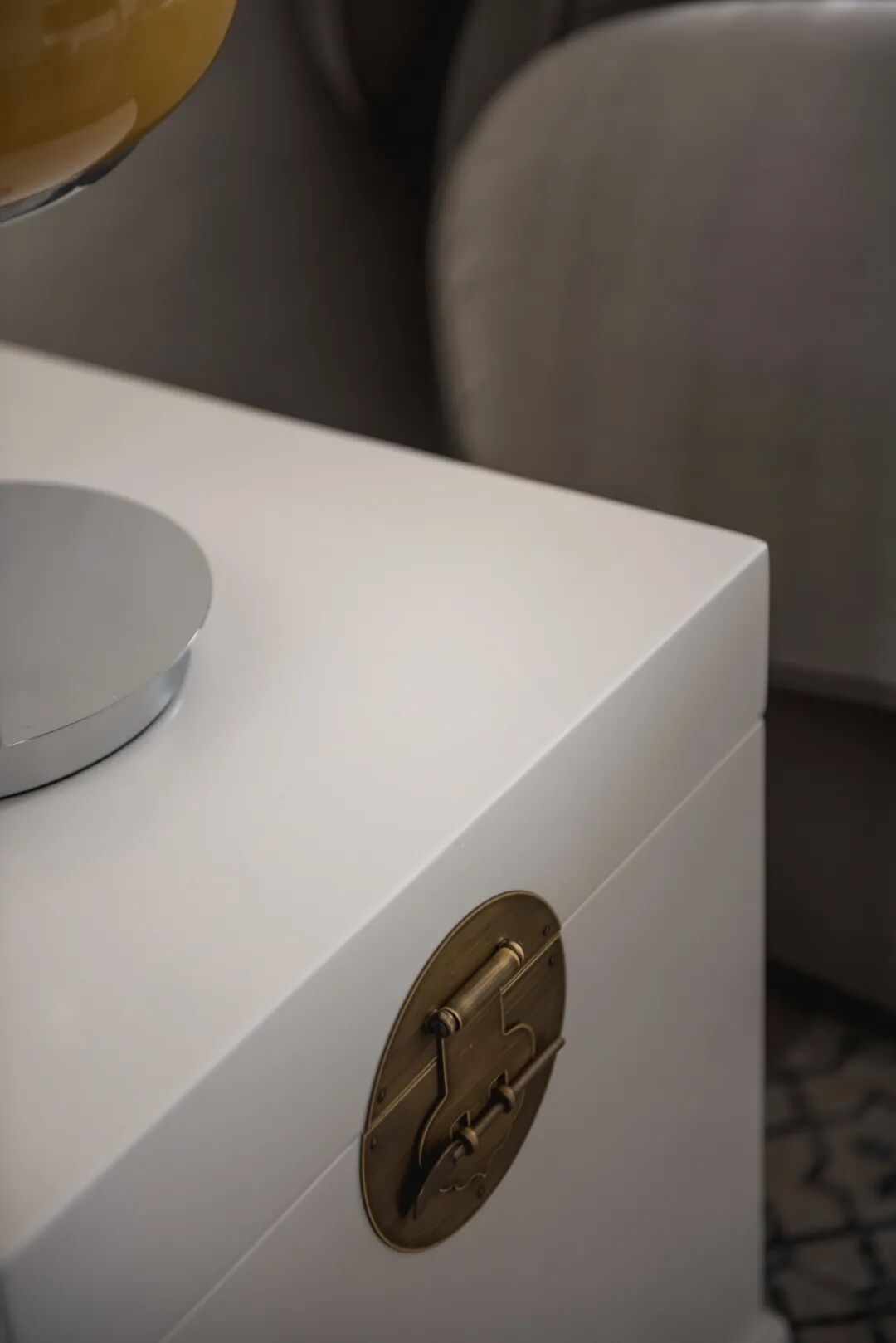 包括家里选的柜子上也带有圆形凹槽的装饰,也是对于全屋弧线线条的一种统一中的变化。当然,吊灯的金属质感在家里也不是独立的,电视两边的落地灯、沙发旁柜子的锁扣还有茶几上的烛台也都是金属。