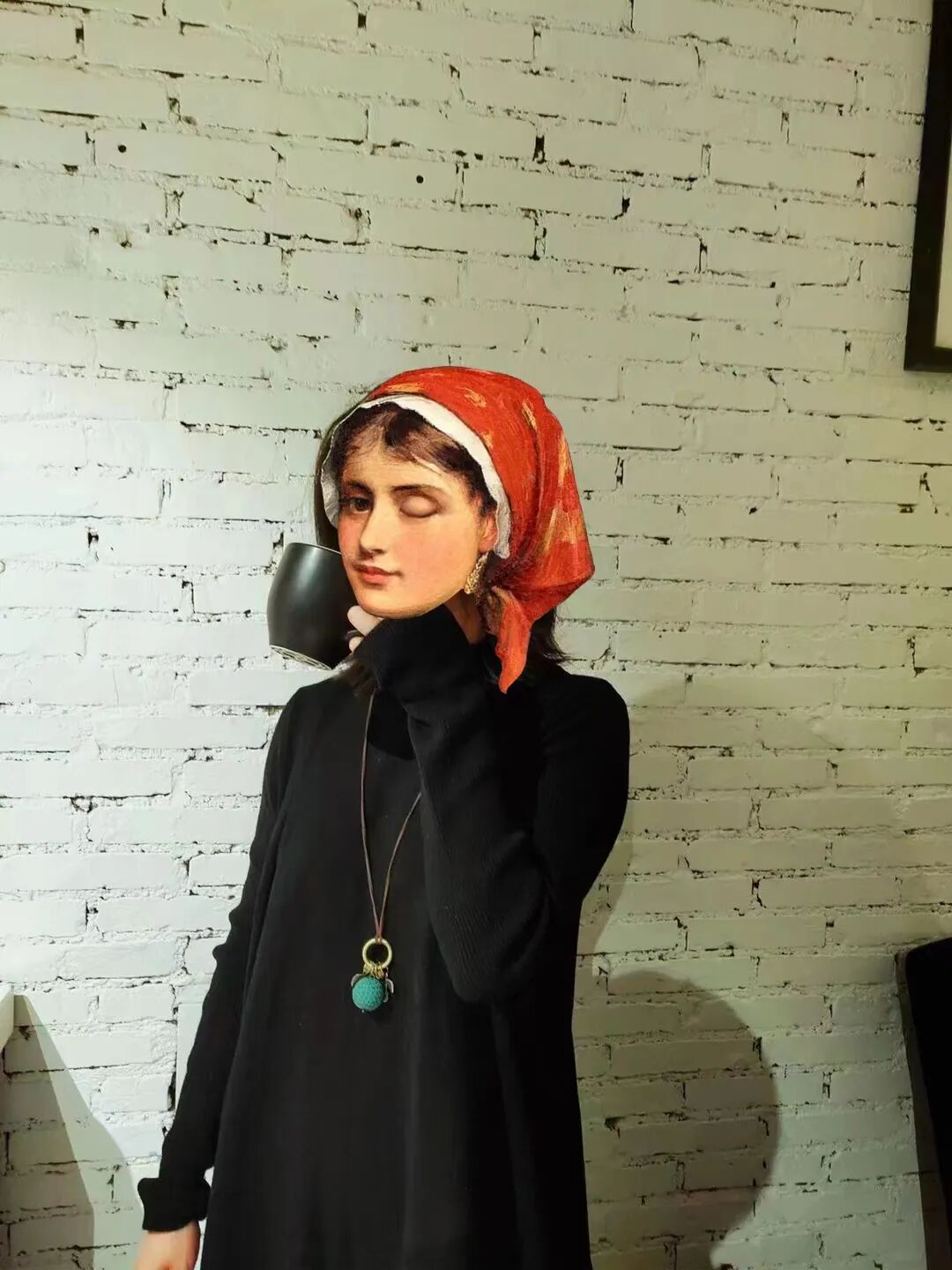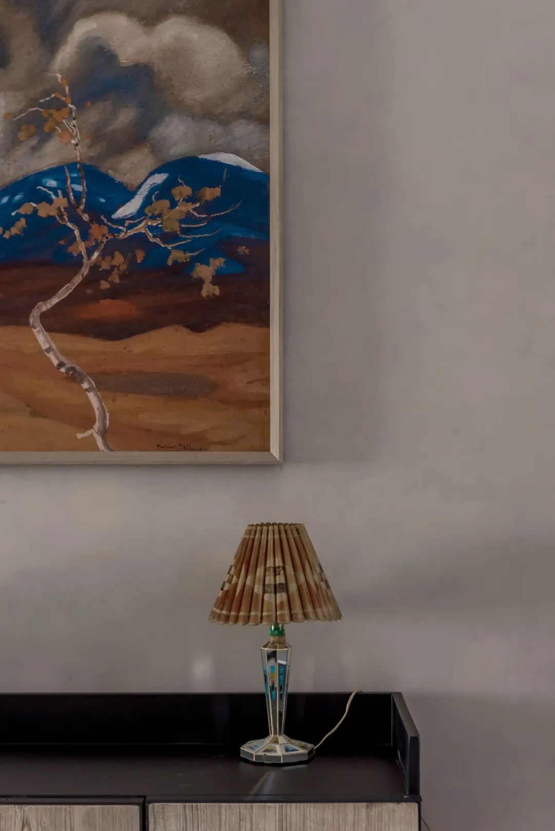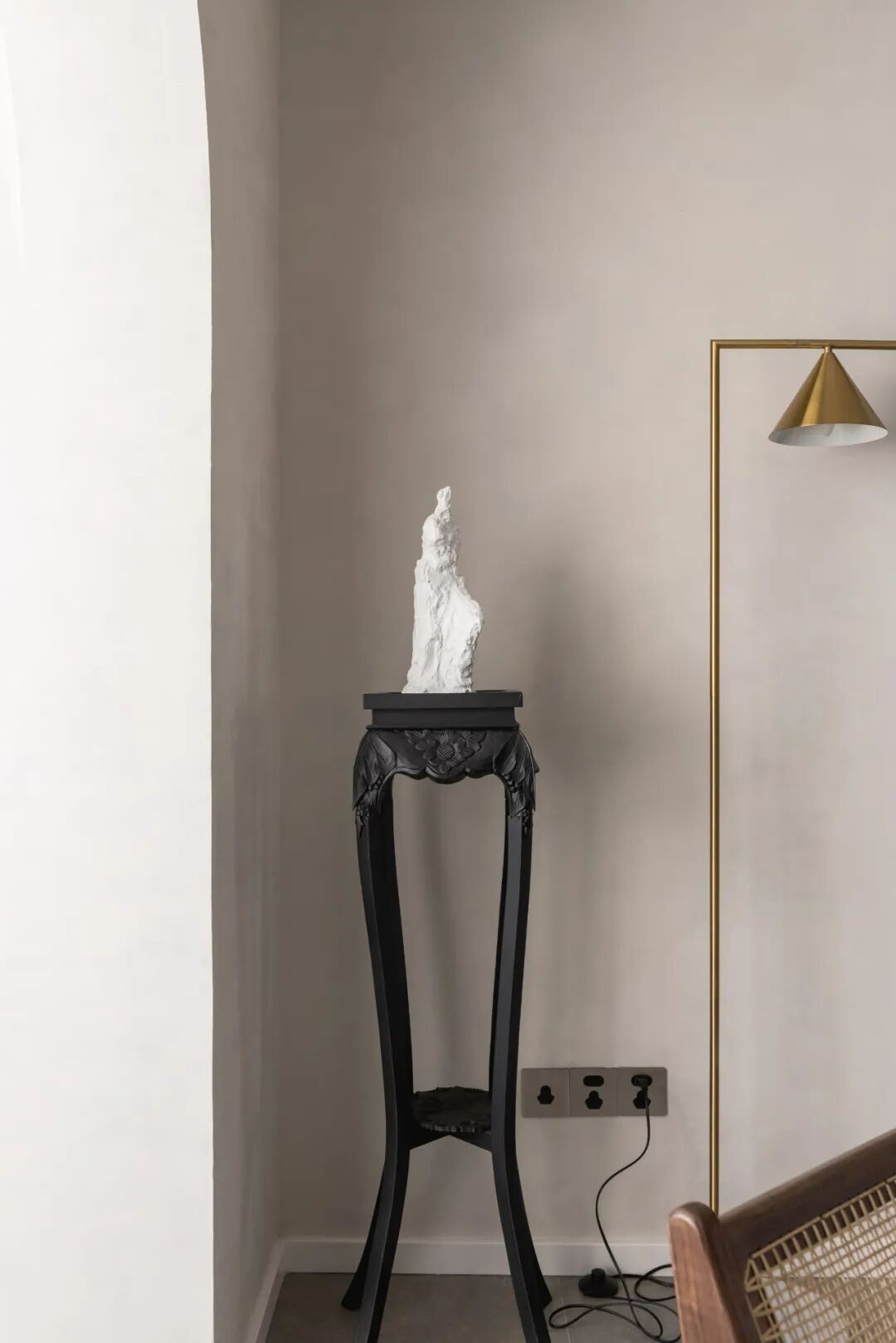 阳台旁边这个雕塑,底座是设计师淘来民国时期的旧物,打磨掉破损的地方后又重新上了漆。拿走廊这个端景的挂画来说,两侧都是门就没必要挂画了。为了强化走廊的宗教感,端景的这幅画还能拉长视线。