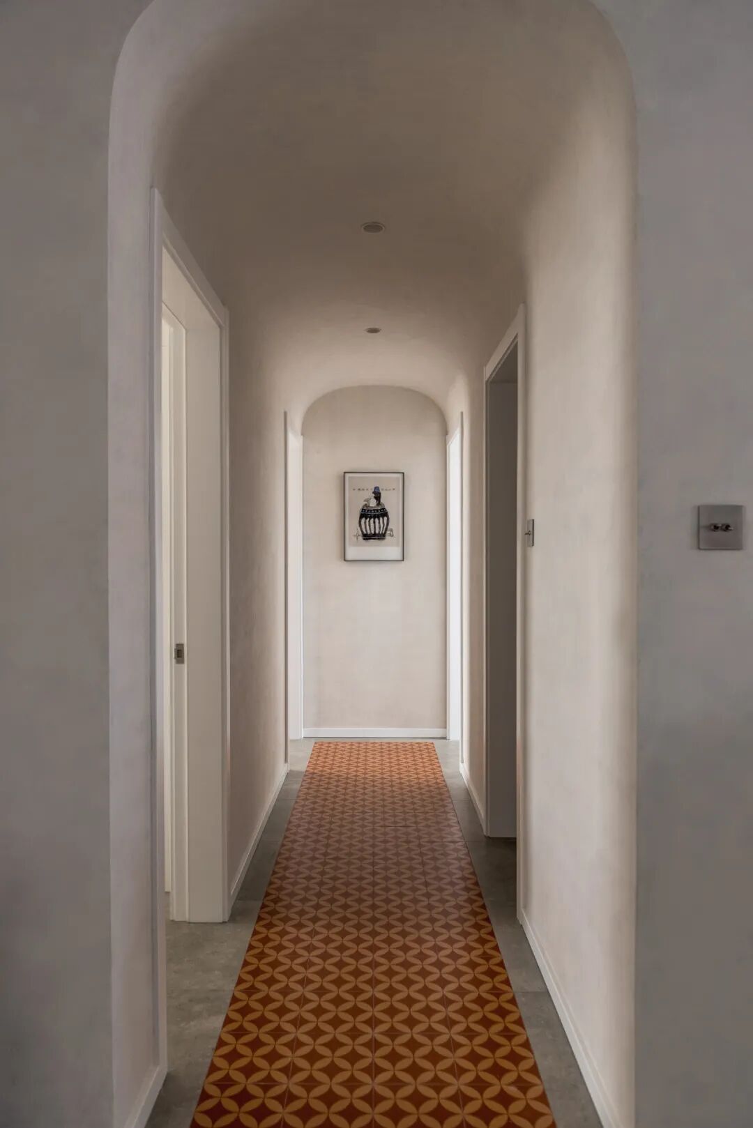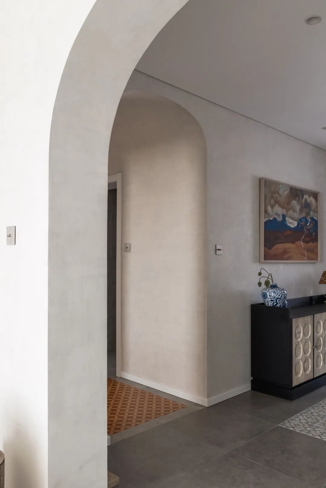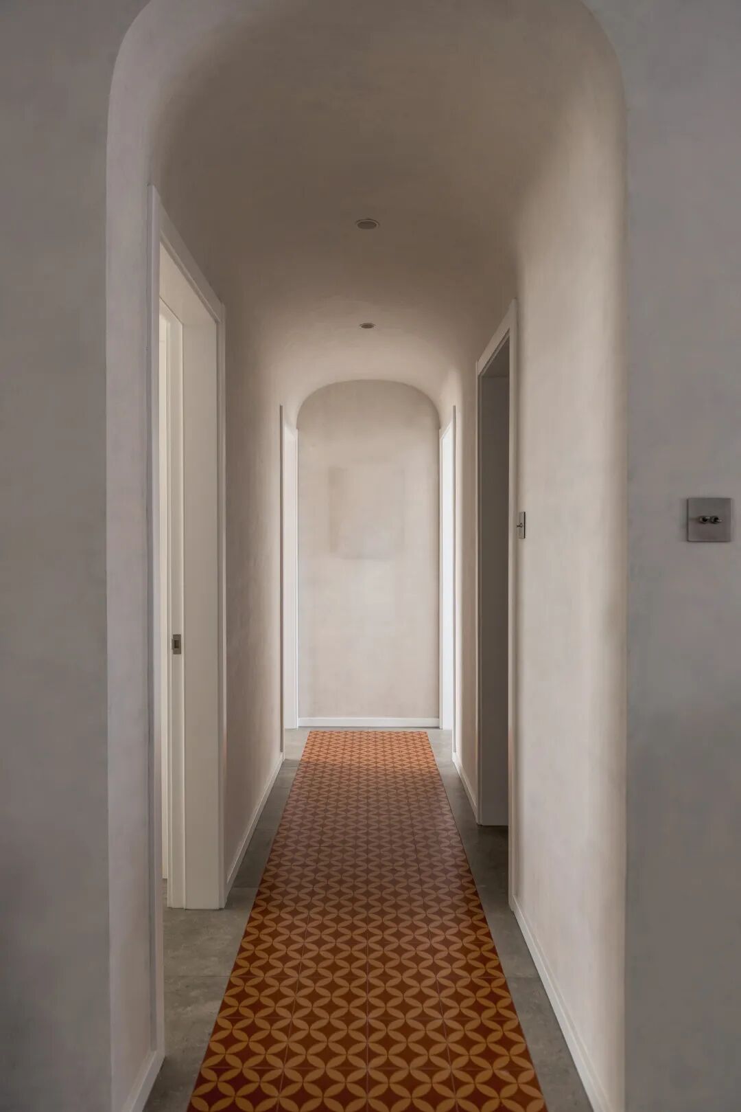 静区走廊天花板完全是拱形的,两侧门打开,自然光线照入走廊,感觉就和清真寺的走廊非常相似。拱形的拔高作用让这个走廊更加深邃,看上去静谧的走廊自然可以让去卧室的人进入睡眠状态。