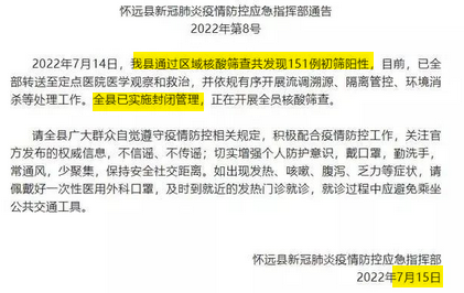 央视新闻客户端今天发布通知,安徽怀远县发现151例阳性,全县封闭管理。