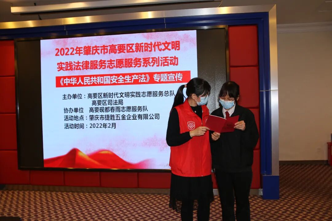 为认真领会新《安全生产法》精神实质、基本原则、主要规定和具体要求,切实提高企业负责人、安全管理人员、从业人员的法律意识和安全意识,近日,肇庆市高要区司法局砚都春雨法律服务志愿者走进肇庆市捷胜五金有限公司,给企业打好预防针,引导员工树立正确的安全观念,提高安全生产意识,真正做到学法、知法、用法、守法。