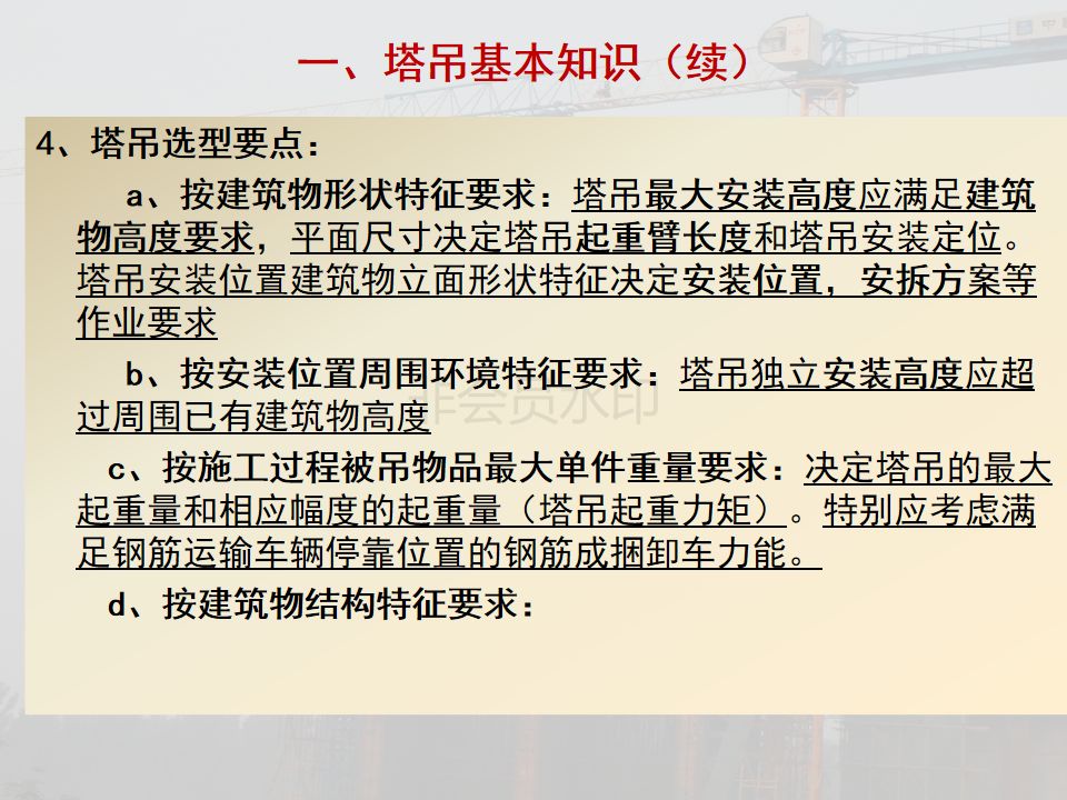 1. 台风来临前,检查塔身、附着装置、机构、广告牌、电气箱、灯具等,是否连接牢固,吊钩升到最高处,吊臂应能随风转动,回转范围内不能有障碍。