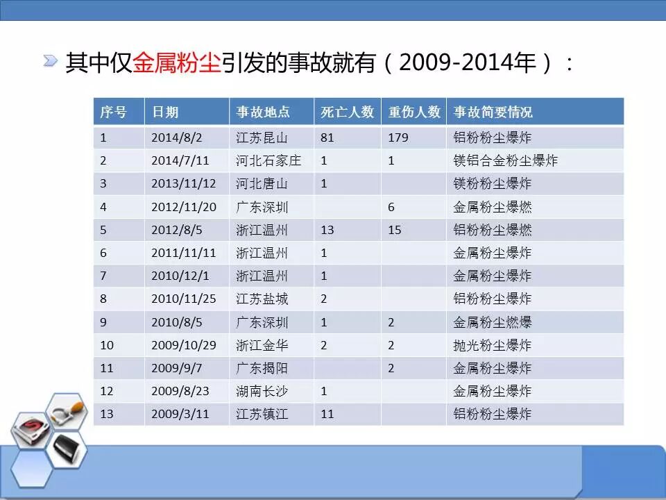 2014年8月2日,江苏昆山中荣金属制品公司发生特别重大铝粉尘爆炸事故,事故发生后的30日报告期内,共有97人死亡、163人受伤;事故报告期后,经全力抢救医治无效陆续死亡49人。