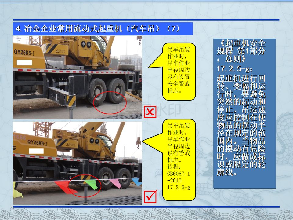 6. 起重机械事故。违章作业或操作不当18起,设备缺陷和安全部件失效或保护装置失灵等原因2起,安全管理、维护保养不到位2起,其它次生原因9起。