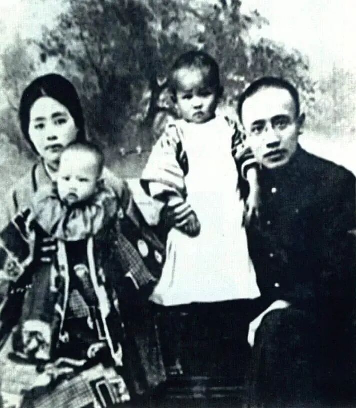 1921年,郭沫若、安娜偕子和夫、博生合影。1916年他与当时在东京圣路加医院任护士的安娜(原名佐藤富子)结识,之后相爱。他们的结合,成为郭沫若诗歌创作激情的另一来源。