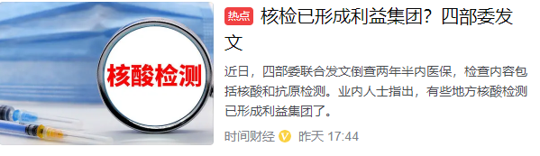有业内人士指出,在核酸检测领域已经形成了利益小团体,在北京雷厉风行斩断核酸检测黑手之后,这一次四部门联手发起的拉网排查,相信会让那些躲在幕后大发国难财的魑魅魍魉统统现出原形!