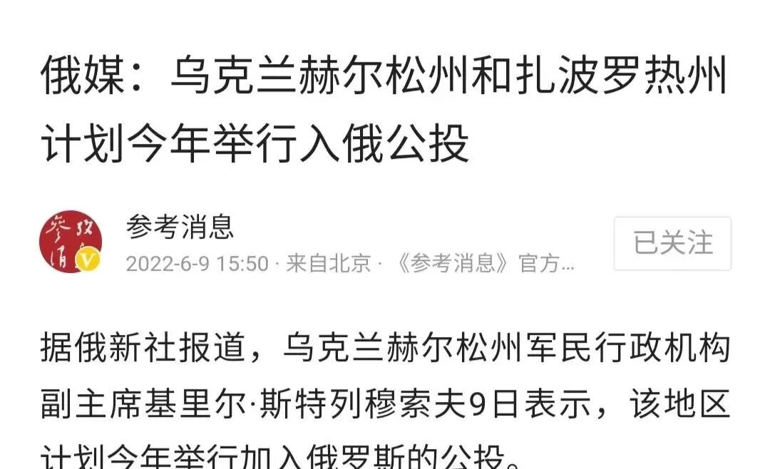 近日,俄罗斯媒体对外爆料,乌克兰的赫尔松州和扎波罗热州计划今年举行入俄公投。