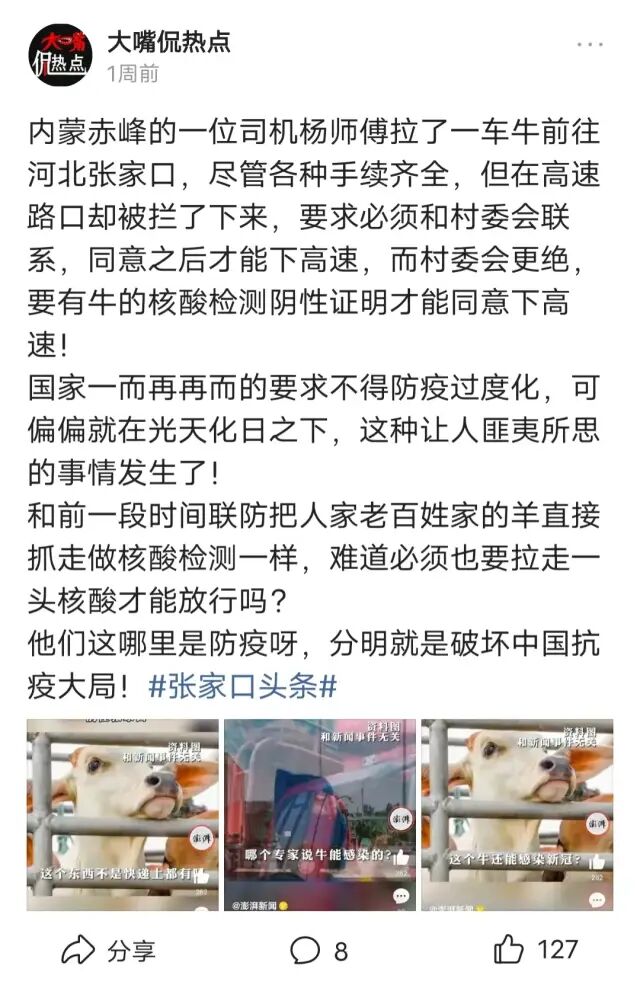 在河北的张家口,前几天就闹出奇葩的事情,来自内蒙的一名司机吐槽,从赤峰往河北张家口送一车肉牛,然而到了张家口尽管各种手续齐全,司机也是凭着最新的核酸证明,当地却不让下站,称必须得有当地村出具的同意证明才能下站,而当地村里给出的结果必须要有牛的核酸检测阴性,证明才能允许出站。