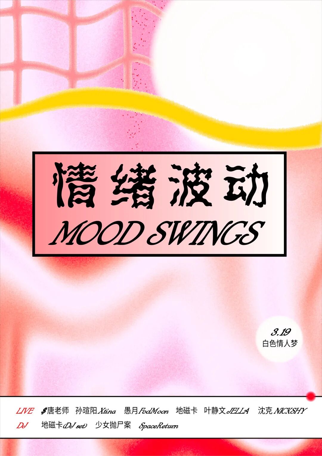 阴晴不定的三月,情绪也跟着天气起伏波动。或是在屋顶眺望璀璨江景,或是在舞池放空身心,纯粹地享受音乐和艺术,度过慵懒的周末时光。本次活动以音乐⇔情绪的波动关系为主题,以创意灯光舞池装饰、外滩露天夜景舞台、互动光影装置艺术为亮点,将人气乐队,潮酷嘻哈,都市歌手,日系偶像,DJ Party与现代艺术相结合,接续三天打造不同心境下的都市潮流派对。