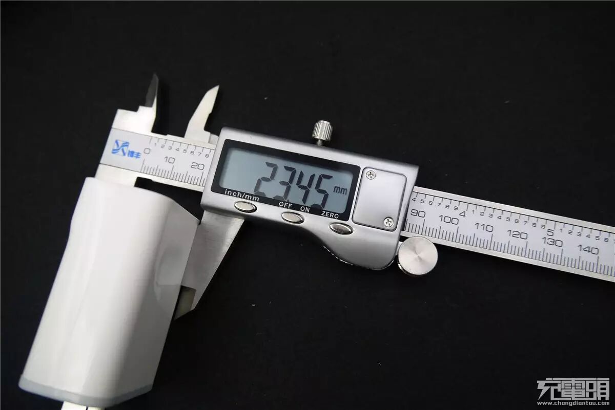 三维数据和体重,不算大,也不算重,标准身材,仔细看充电器两侧,有放手指的浅凹槽。