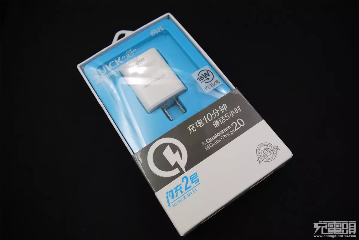 产品包装简单明了,正面印刷着快充手机大部分采用的宣传语,即充电X分钟,通话X小时,有高通QC2.0的Logo,产品名称是闪冲2号,型号Z-U111,当然我不知道闪冲1号是什么样子的,另外透明塑料壳上贴有16w的字样,因该是描述产品最大输出功率为16w,右下角怎是建议零售价78元,对于一个QC2.0充电器来说,不便宜。总的来看包装相对体积偏大,对比Aukey、JDB那种比较环保的包装而言,这个更像是在商店里面挂着卖的,这可能就是线上渠道、线下渠道产品包装的区别吧。