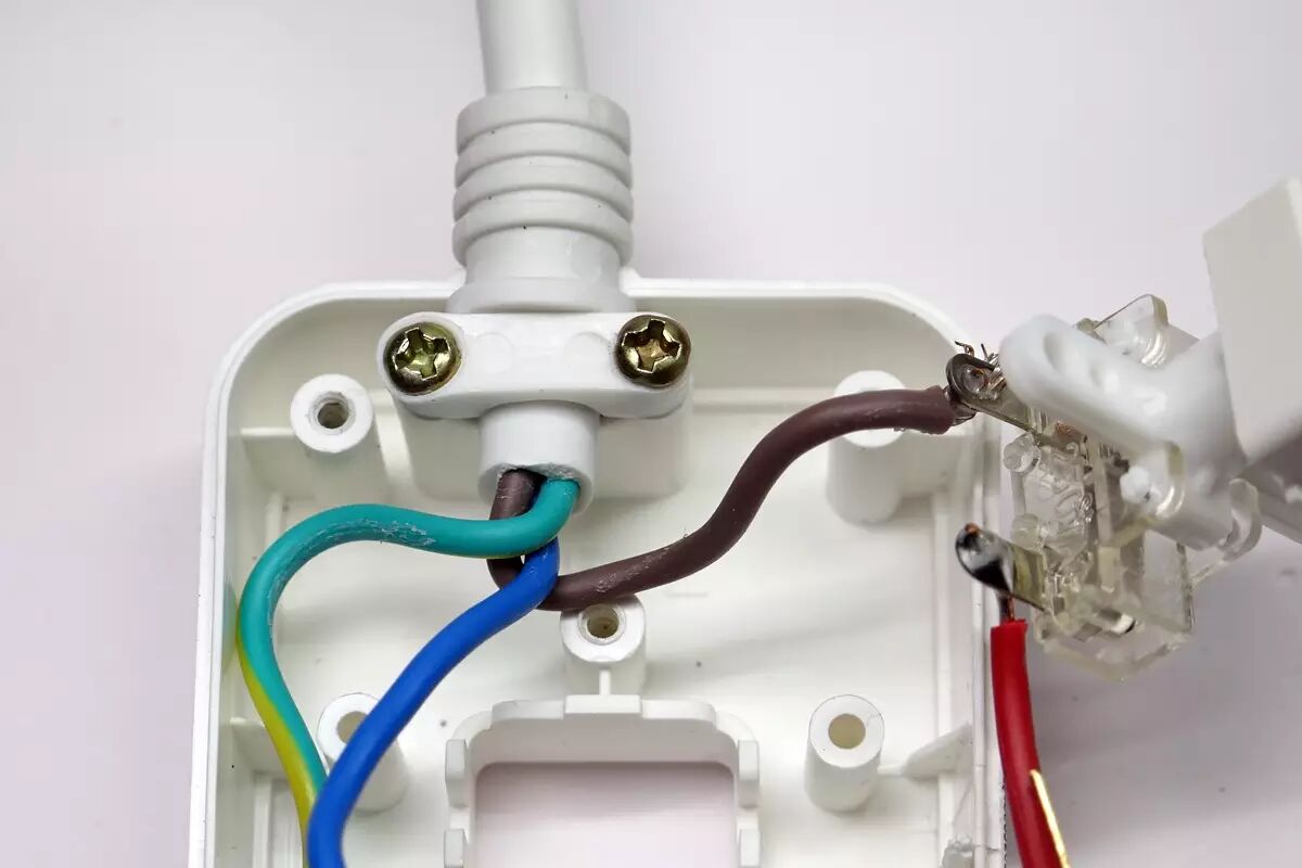 进线端红线为火线,蓝线为零线,黄绿相间为地线,开关接在火线上,符合国标规范。地线铜条与火线、蓝线铜条存在一个高度差,并不会碰在一起,只是这个拍照角度看起来好像挨在了一起。插座铜条安插于各自的孔位中绝缘隔离,由底盖上凸起的小塑料柱压紧防止位移。