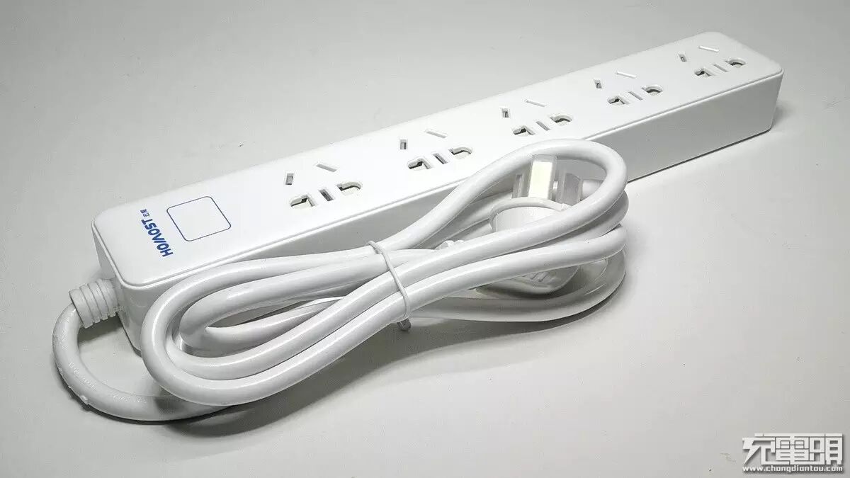 插线板顶端蓝色“HOMOST宏魔”logo下方有一个蓝色方框,就是开关了。