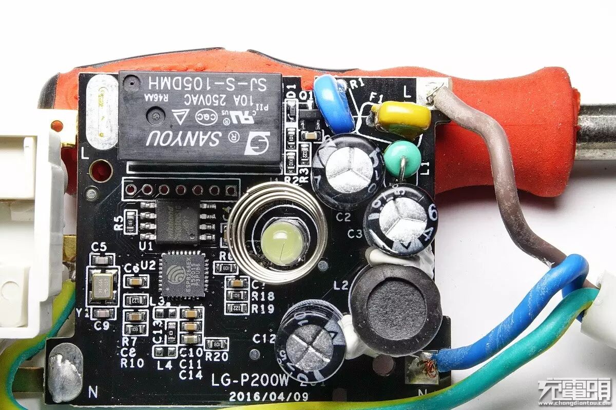 由于没有机械开关,其实模具和装配更省事了。主控板上有一只较高高的塔形弹簧,上下盖合起来时会紧贴在面板触摸区域,用于感应人肉信号。塔簧中心是白光LED,上盖并未开孔,透射显示。左下角一颗黄色原件为保险丝,圆片状蓝色原件为7D471K压敏电阻,用于吸收浪涌电压,当电网出现异常过压高峰时会瞬间通过前面的保险丝泄放掉以保护后面电路,这个易与Y电容相混淆,注意其标识及PCB代号为R(电阻),而非电容(C)。黄色保险丝身后露出半拉身子的绿色小清新原件为色环电感,PCB符号为L,易与电阻相混淆。