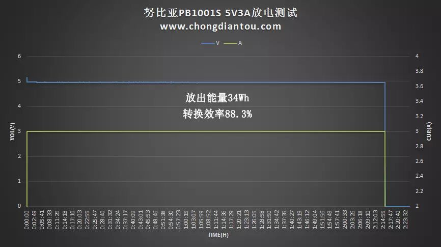 5V3A放电状态下,放出能量34Wh,转化效率88.3%,表现十分优秀。