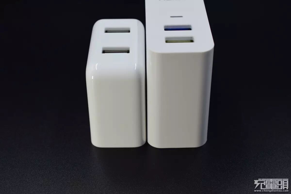 输出端面也有着明显的区别,紫米的双口插座间距大,而魅族的间距小,在这点上,紫米在使用体验上更占优势,更加人性化。但是紫米没有任何灯光指示,魅族MU11有一枚能随输出电压大小改变光强度的蓝色LED指示。另外输出端面,一个全白一个有魅族Logo。