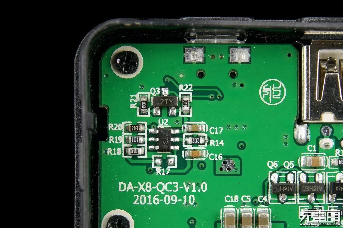 电池组保护板IC,作用与DW01类似,USB母座左手边有一个LED,移动电源运行在快充模式时这个LED会亮起红光,红光可透出LED母座。