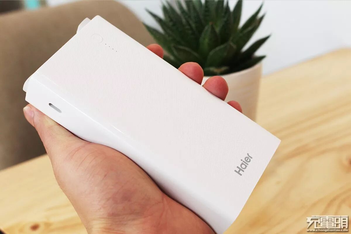 外观方面,海尔HY003移动电源呈现白色设计风格,整体看起来比较洁净。正面能看到的是电源按键、电量指示灯以及底部的品牌logo。