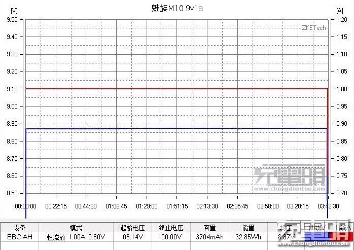 9V1A 放电效率,开始电压5.14V,带载时握手成功输出9v,全程保持8.87V,波动情况基本没有,十分稳定。