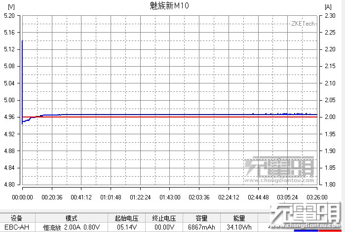 5V2A 放电效率,开始电压5.14V,带载后保持4.97V,波动情况基本没有,十分稳定。