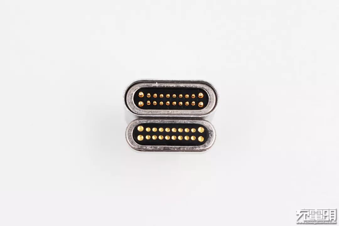 除了磁吸力强、对位准确之外,这款连接器最大的特点就是支持正反插和USB3.1传输功能。从连接器的触点就可以看得出,这款产品并不简单。Type-C公头和母座连接处分别排布着10组20个镀金10u铜触点,最外侧的两对比较粗大的触点为电力触点,其余的为数据触点。