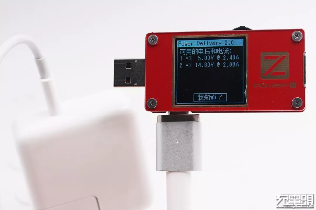 二、测试在使用Type-C磁吸连接器后,对苹果29W USB PD充电器进行诱骗,ChargerLAB POWER-Z KT001显示支持USB PD通讯,诱骗出的电压分别是5V和14.8V。
