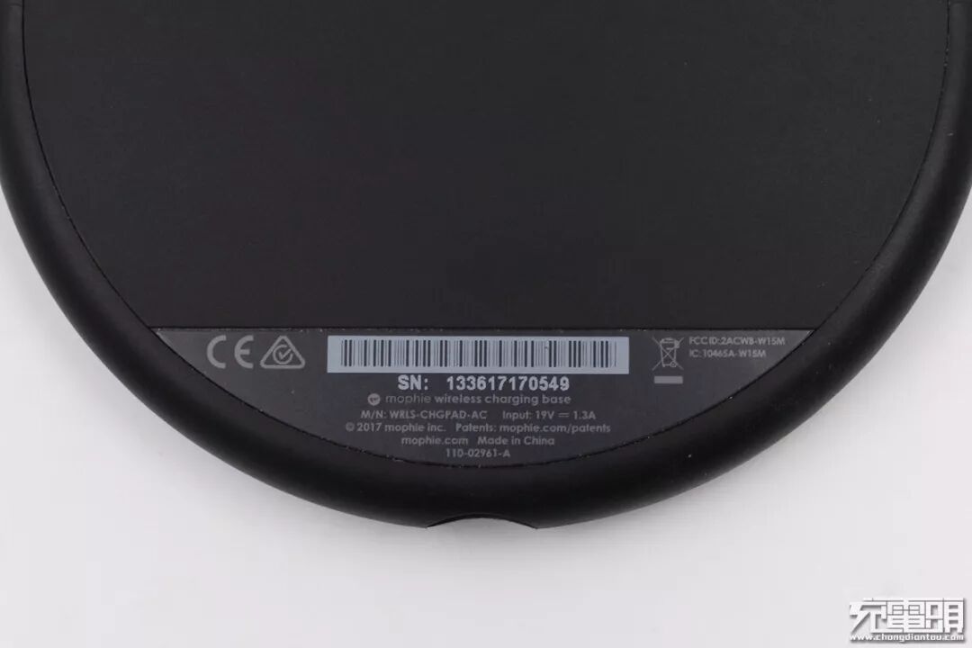Mophie无线充参数,只标注了输入参数,19V/1.3A;有CE和RCM认证。