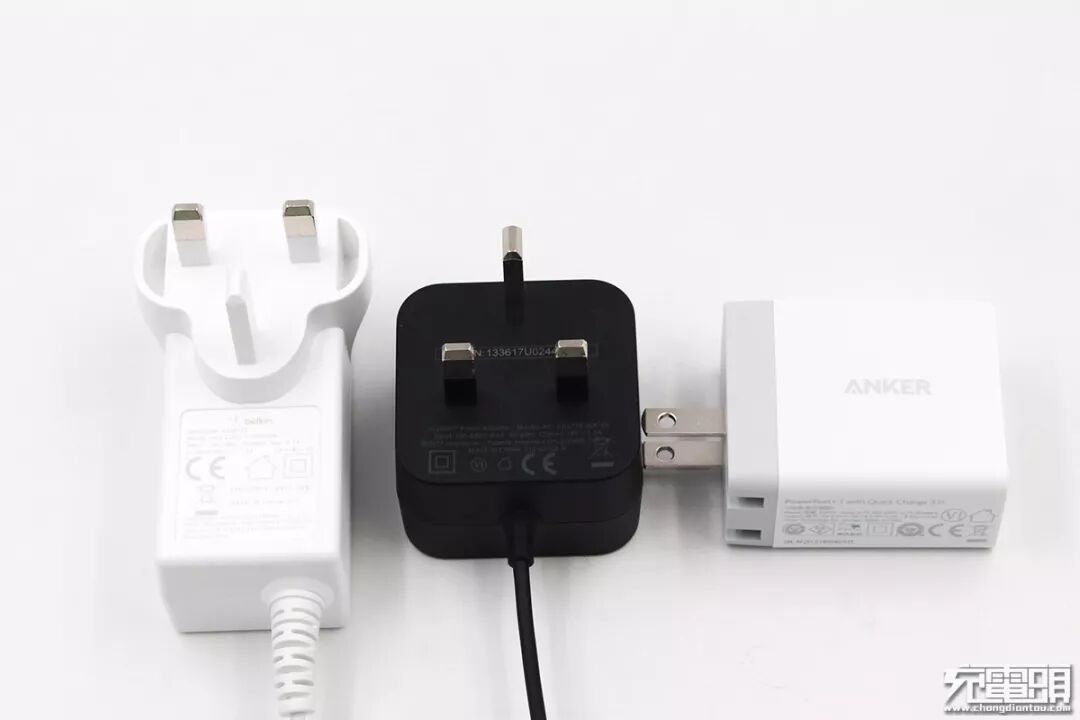 说完无线充主体,再来看三款无线充电器标配的电源适配器。手上Mophie、Belkin的电源适配器均为英规插头(也有国标的),Anker的为美规插头,兼容国标。需要指出的是,由于Mophie、Belkin两款无线充电器均采用固定的直流电压输入,所以电源适配器均为定制产品,互换性比较差。而Anker标配的是QC3.0快充标准的充电器,互换性强;另外充电器还应用了Anker自家的IQ智能识别技术,支持APPLE2.4A充电协议。所以,即使不搭配无线充电器使用,也可以直接用来给iPhone、小米、索尼、三星等品牌手机快速充电,实用性很强。