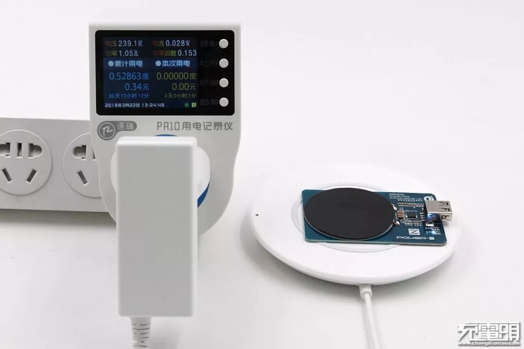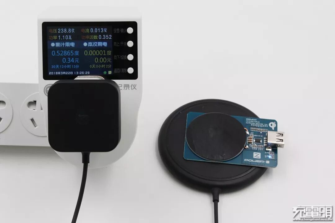 然后使用ChargerLAB POWER-Z无线充电接收板分别将三款无线充电器激活,在没有输出的情况下查看充电器的整体功耗。