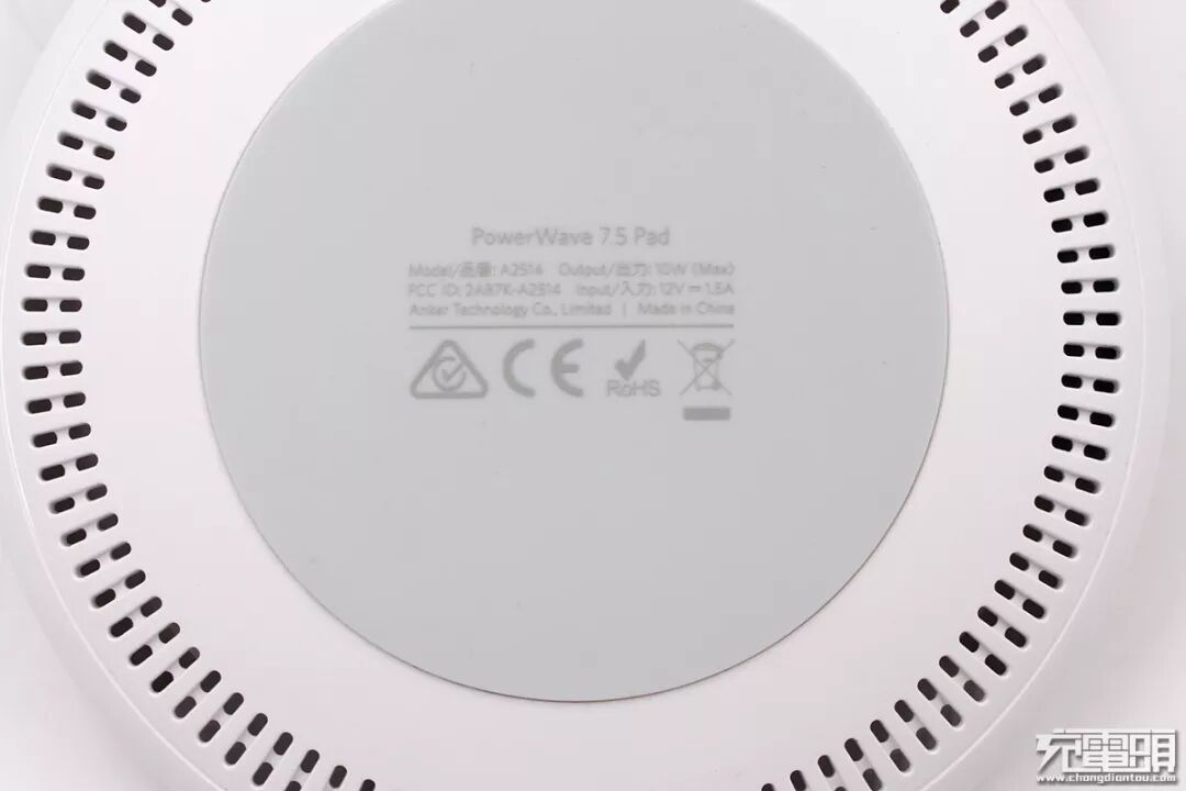 Anker无线充型号A2514,通过了FCC、RMC、CE、RoHS认证。另外我们可以看到,在三款无线充电器中,只有Anker背面设计了许多小孔,这是因为Anker这款无线充内置了主动散热风扇的缘故,主动散热风扇可以在手机充电过程中及时降温,确保充电器、手机不出现过热以致降低充电功率,以此来保障长时间的大功率充电,达到无线快充的目的。