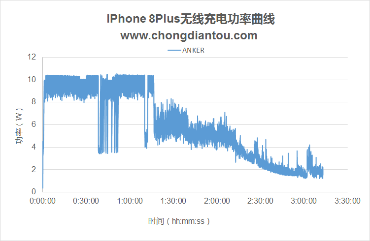 先来看Mophie和Belkin这两款无线充电器的功率曲线,在刚充电开始时都有一段恒定功率时间,不过这段时间很短,均在15分钟之内,随后无线充电功率会在一个高功率和一个低功率之间来回波动。