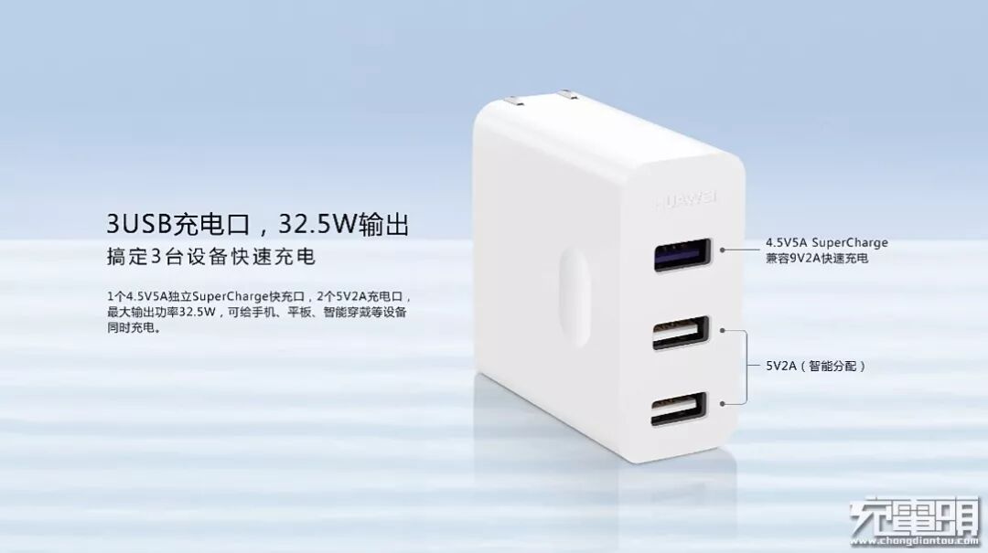 该款充电器配备了一个独立输出的SuperCharge超级快充接口和两个5V/2A输出接口,可同时给手机、平板、智能穿戴设备同时充电。此外,超级快充口支持还支持华为FCP快充协议,可兼容华为P9、mate8、荣耀V9、荣耀V8等手机快速充电。