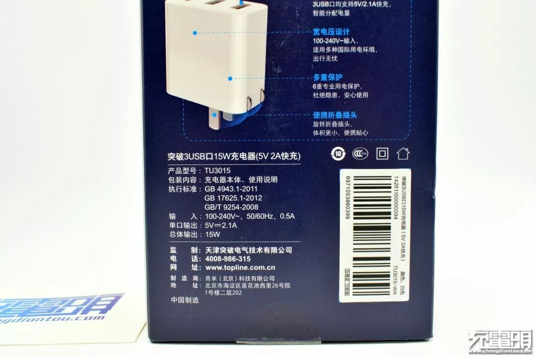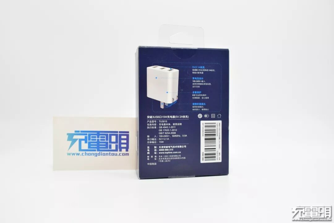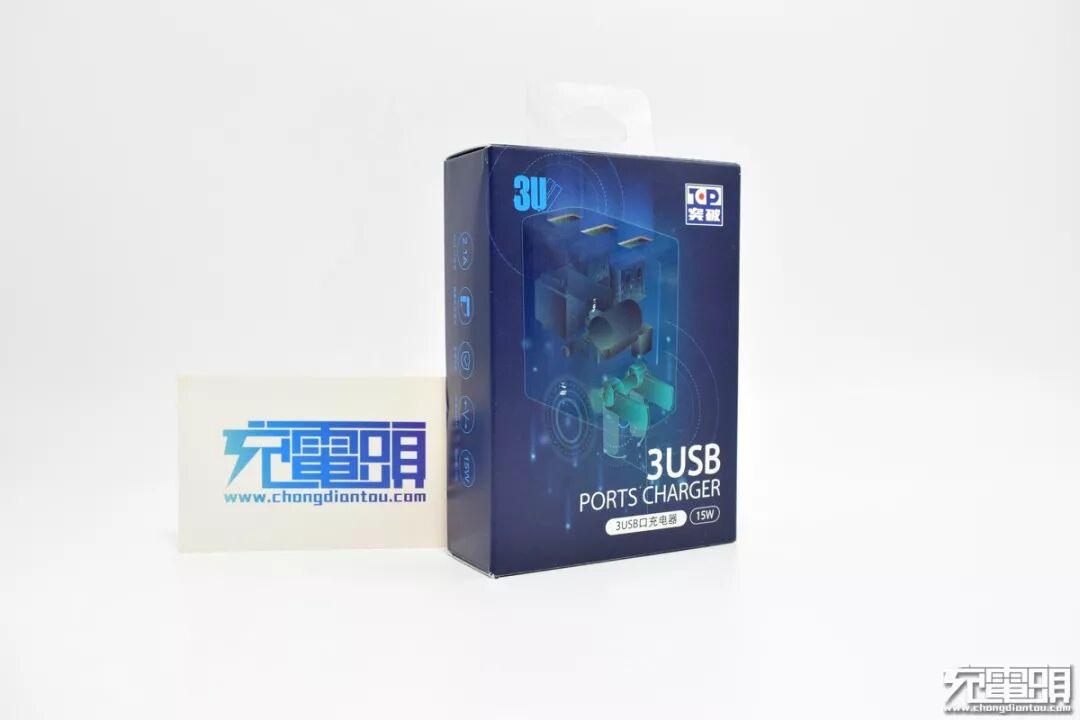 一、突破三USB口充电器开箱突破的蓝色调彩印包装盒,在同类产品多采用的白色或牛皮纸素色中显得比较特别,带着展示挂孔但是包装并未开窗。