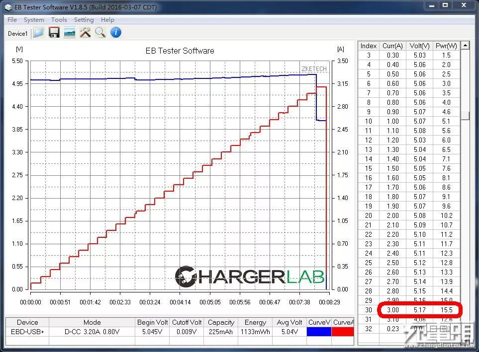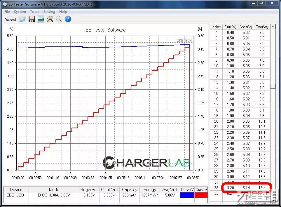 3、输出能力1口实测数据:最大输出 5.14V/3.20A,16.5W,略超过标称15W,没有出现单口 2.1A限流,线补呈现两阶段形式,以1.3A为分界点。