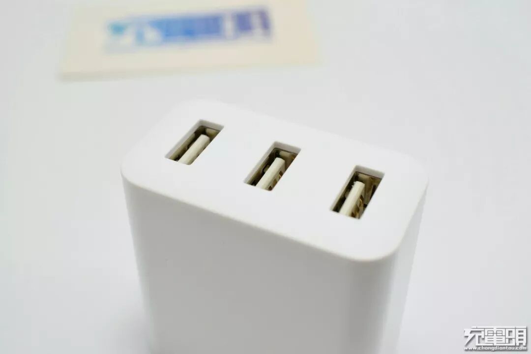 顶面表面是磨砂处理,3枚白胶舌USB母座表明这是一款非快充产品。