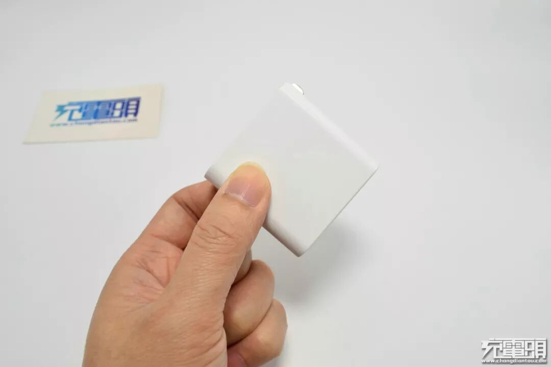 产品体积小巧,长边圆弧,两端面平整,其实与青米3USB口充电器完全一致。整体类似正方,长宽约50mm,厚度约28mm。