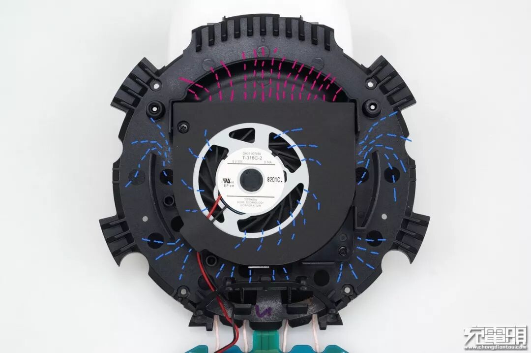 风扇拿掉后可以看到,气流对整个内构件散热,出风口有一个打横的软胶垫直接把冷热风阻隔。