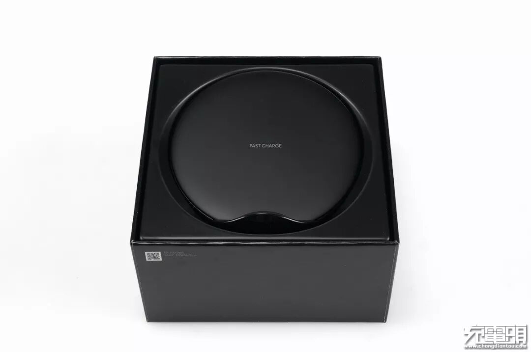 打开包装,圆形造型的充电器本体安静的躺在里面,无线充电器正面标有“FAST CHARGE”字样,表明支持无线快充。